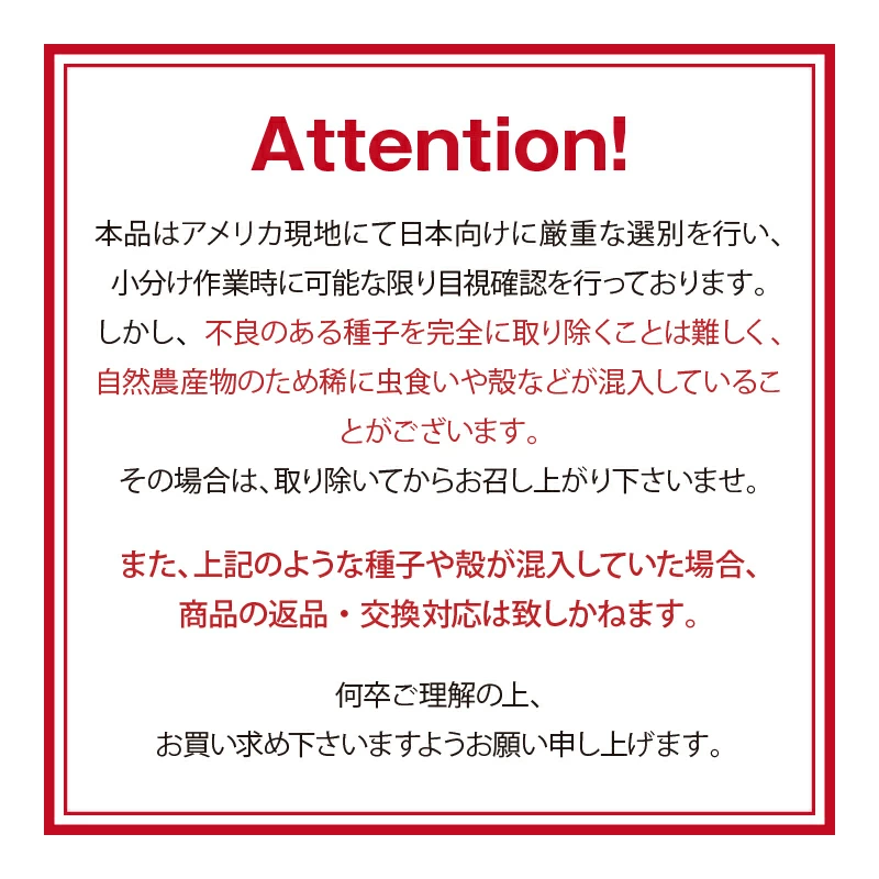 | 注意事項 | ※本製品は、落花生・小麦を使用した製品と同じ施設で加工しています。 ※開封後は密閉容器等に保存して賞味期限に関わらずお早めにお召し上がり下さい。 |